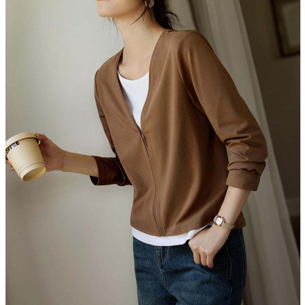 All-match Intellectual Zipper-style Fake Two-piece Contrasting Long-sleeved T-shirt Autumn Two-piece Long-sleeved T-shirt