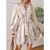 V-neck Fashion Print Waist Long Sleeve Dress for Women