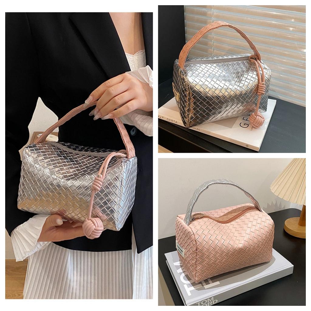 New Woven Handbag Women's Silver Pink Spliced Cosmetic Bag Makeup Bag Toilet Bag Unique Design Handbag Tote Bags for Women