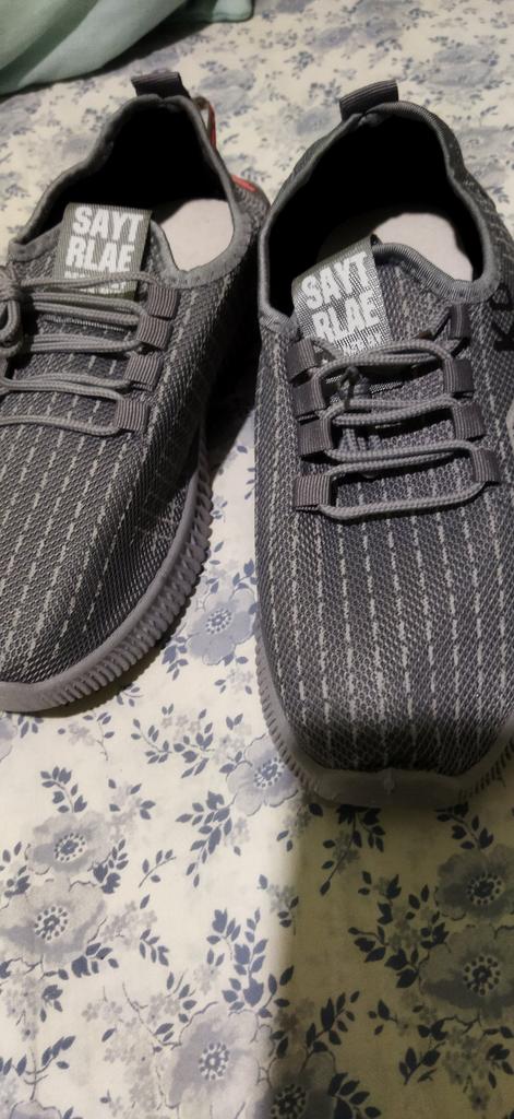 The shoes are gray. The image suggests a bluish hue.