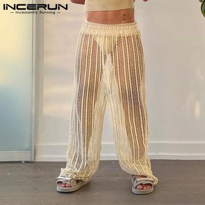 INCERUN Men Drawstring Elastic Waist Hollow Out Fishnet Beach Holiday Long Pants