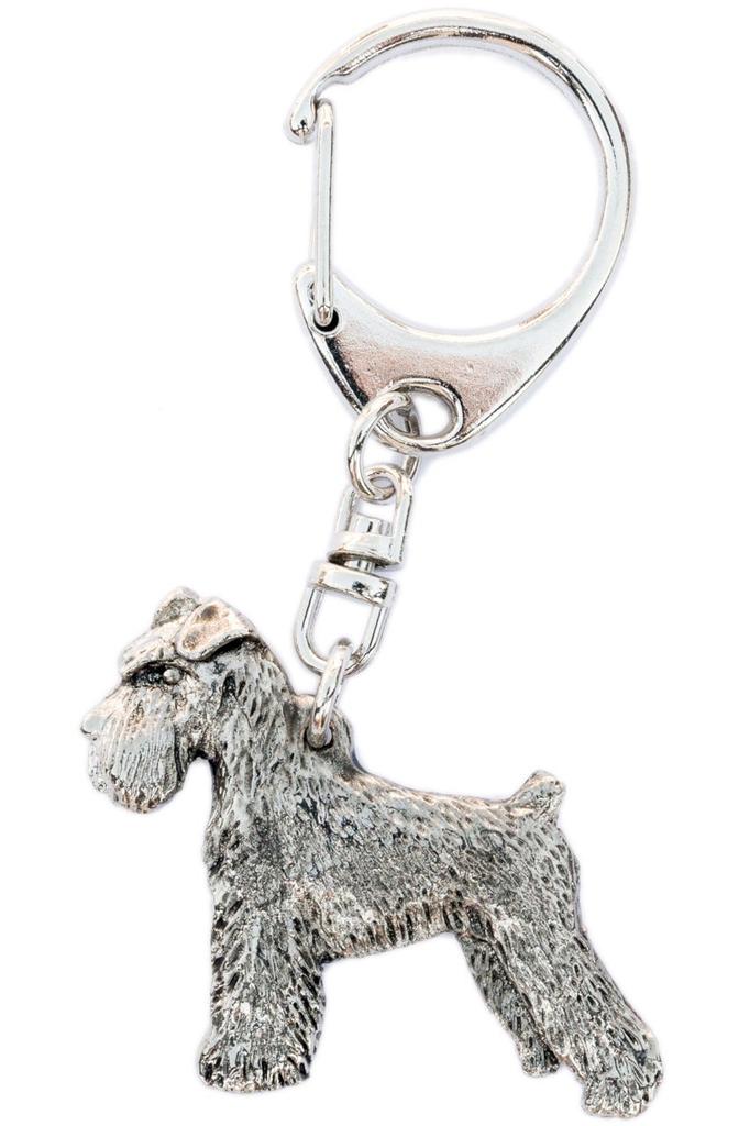 This is an elaborate and antique-looking metal (alloy, antique silver finish) dog key chain made by Alden Arts, a British manufacturer with over 50 years of history and tradition.