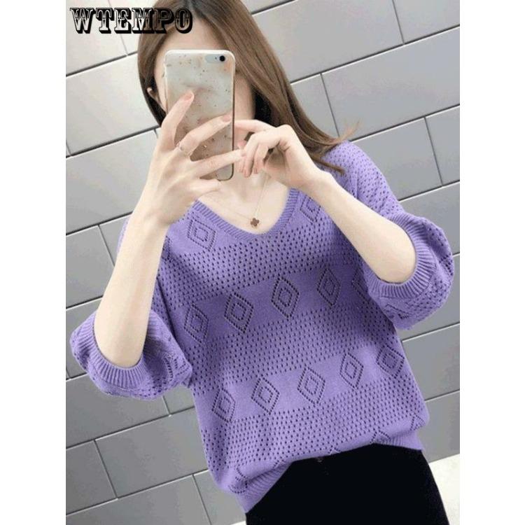 Spring and Summer V-neck Hollow Out Knitted Sweater for Women Loose Korean Version Bat Top for Women