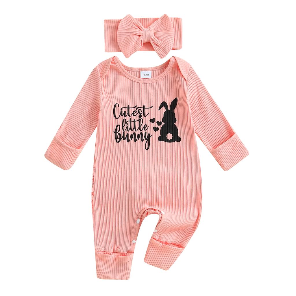 Baby Girls Rompers Easter Clothes Letter Rabbit Print Frills Infant Bodysuits Jumpsuits with Headband