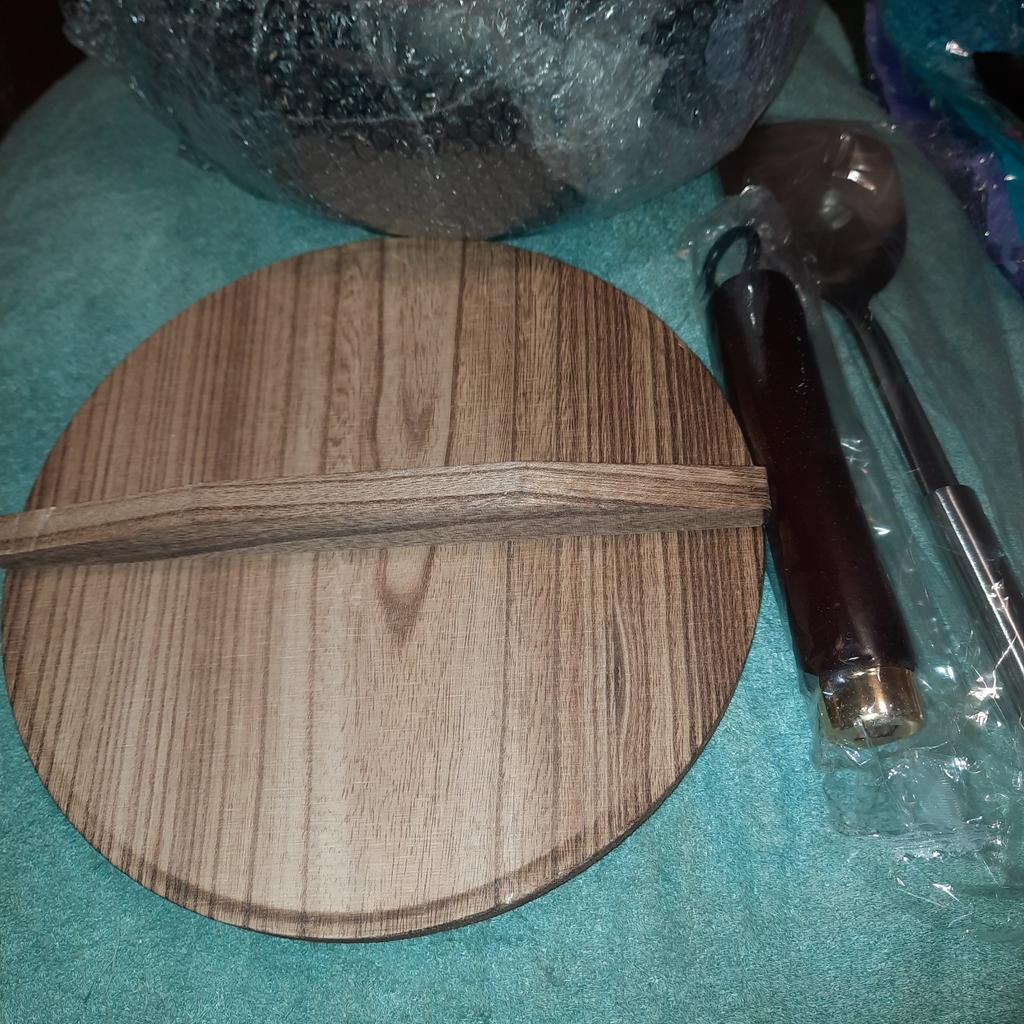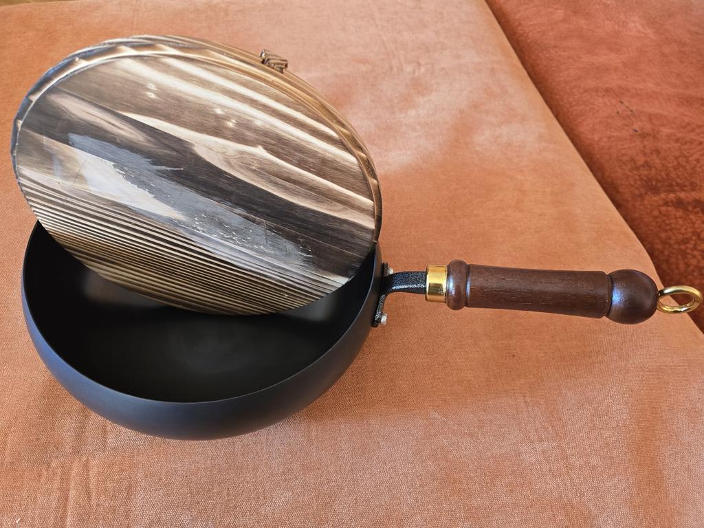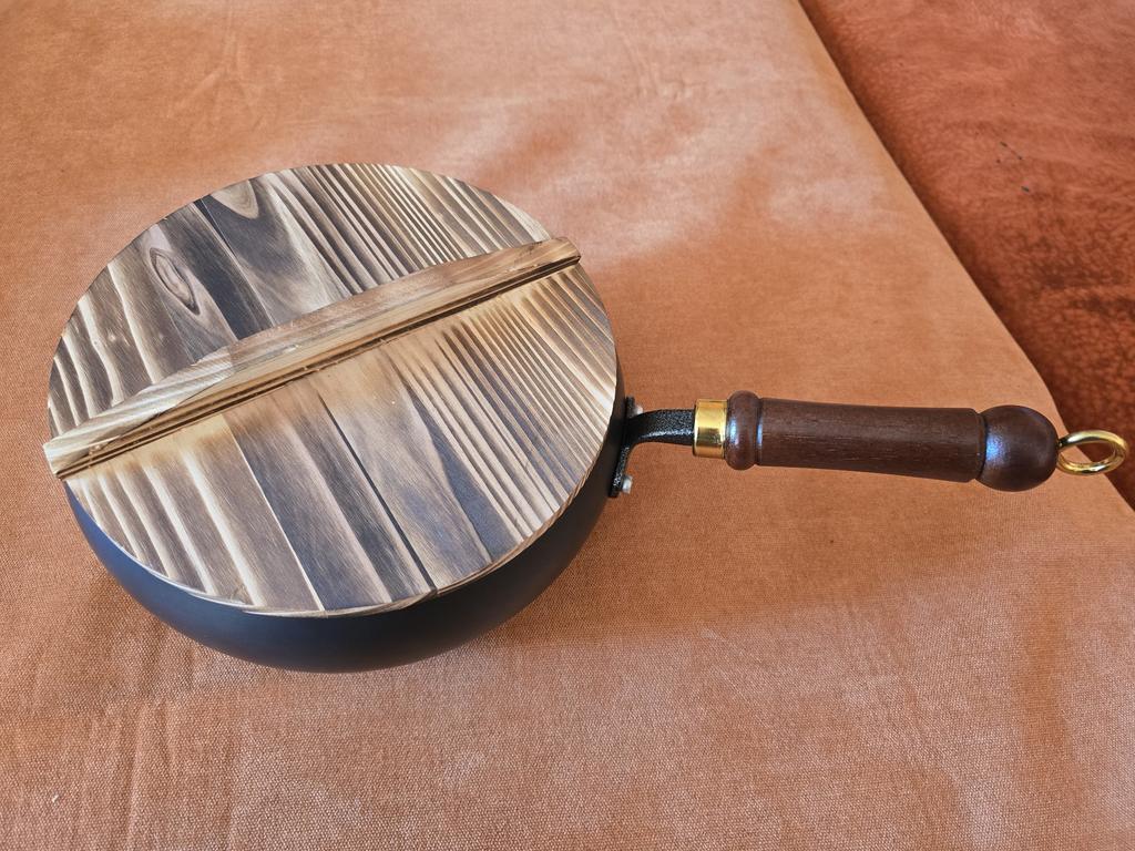 Good frying pan, deep, heavy. Wooden lid.