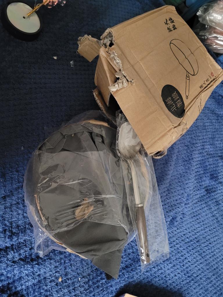 The frying pan is quite heavy, but the bottom is thin. The shape is good, it's great for stewing. However, I can't understand if the included metal spatula can be used? The box is torn, but the frying pan itself is not damaged. The lid is good, but with a split that is getting bigger. It's good that a regular glass lid with a diameter of 24 cm fits.