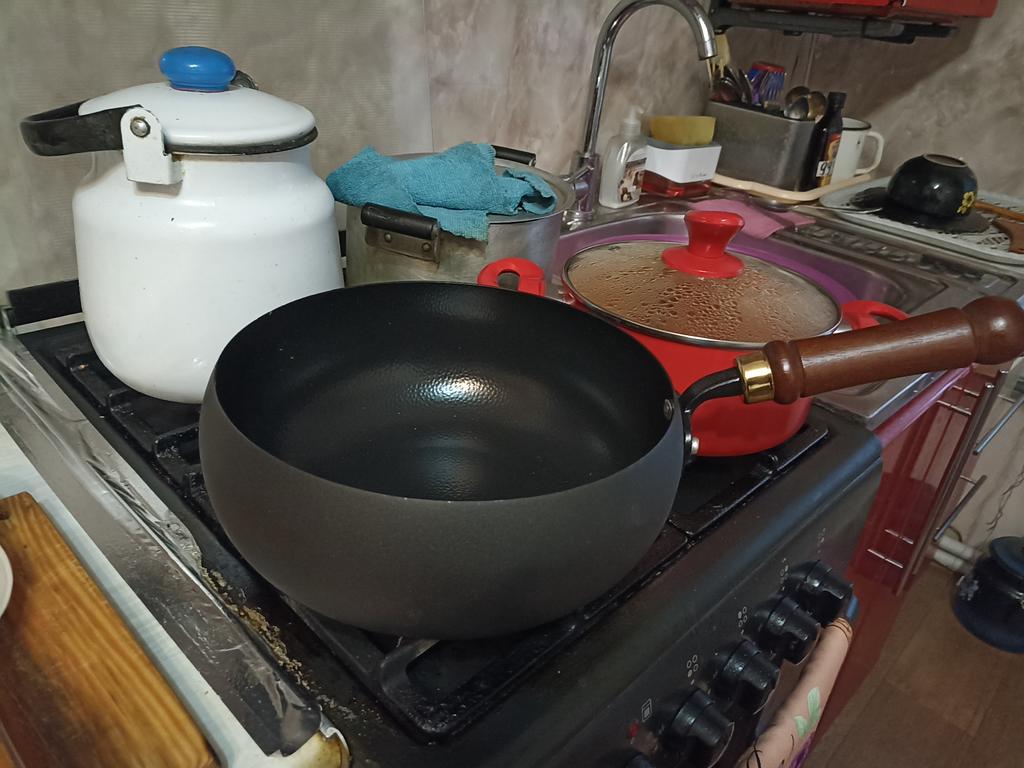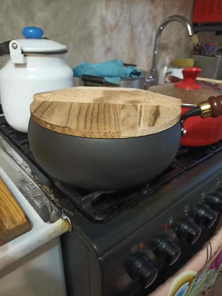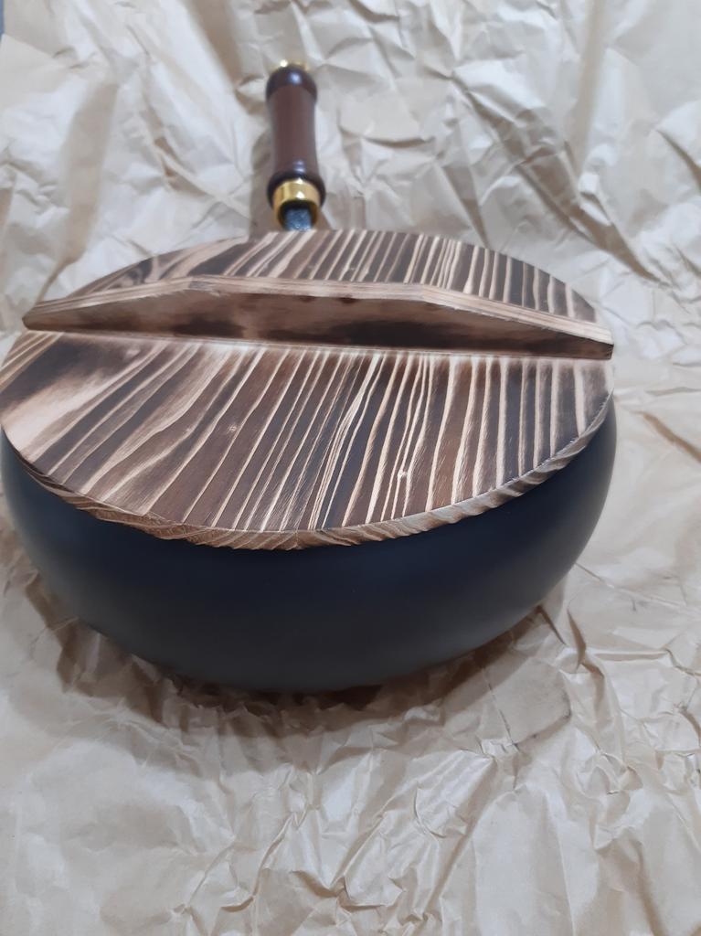 The frying pan is good, but there is one nuance: the lid is not wooden, and the edges are all chipped.