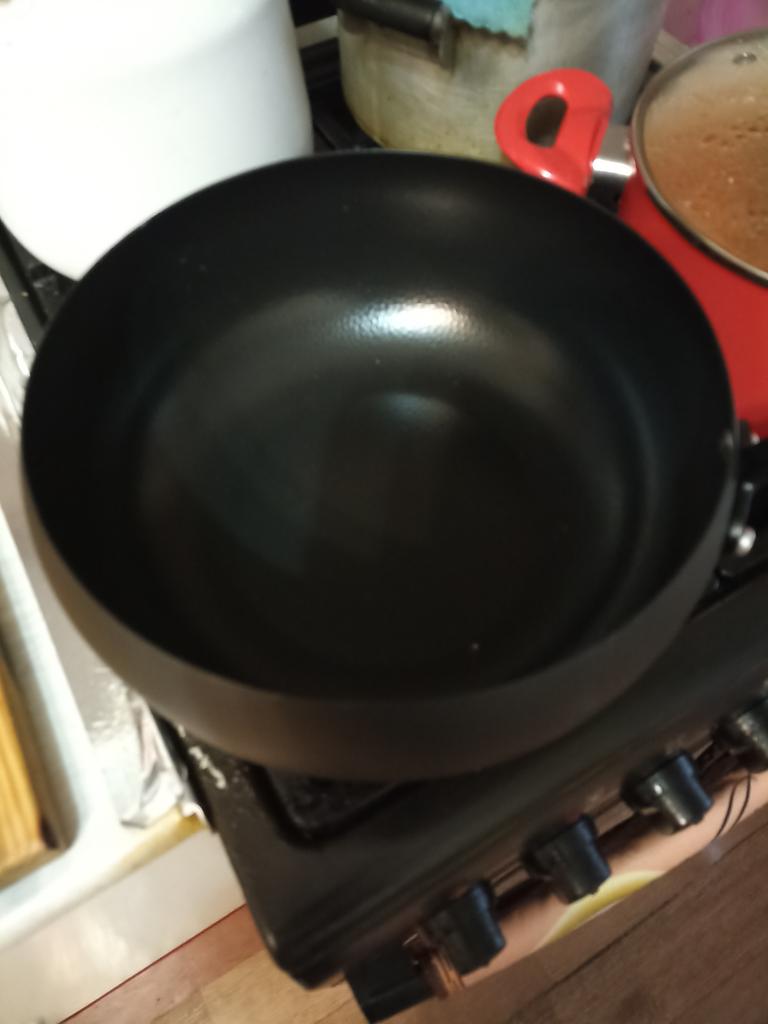 The frying pan is heavy, deep, but the onion burned instantly. I will adjust to it.