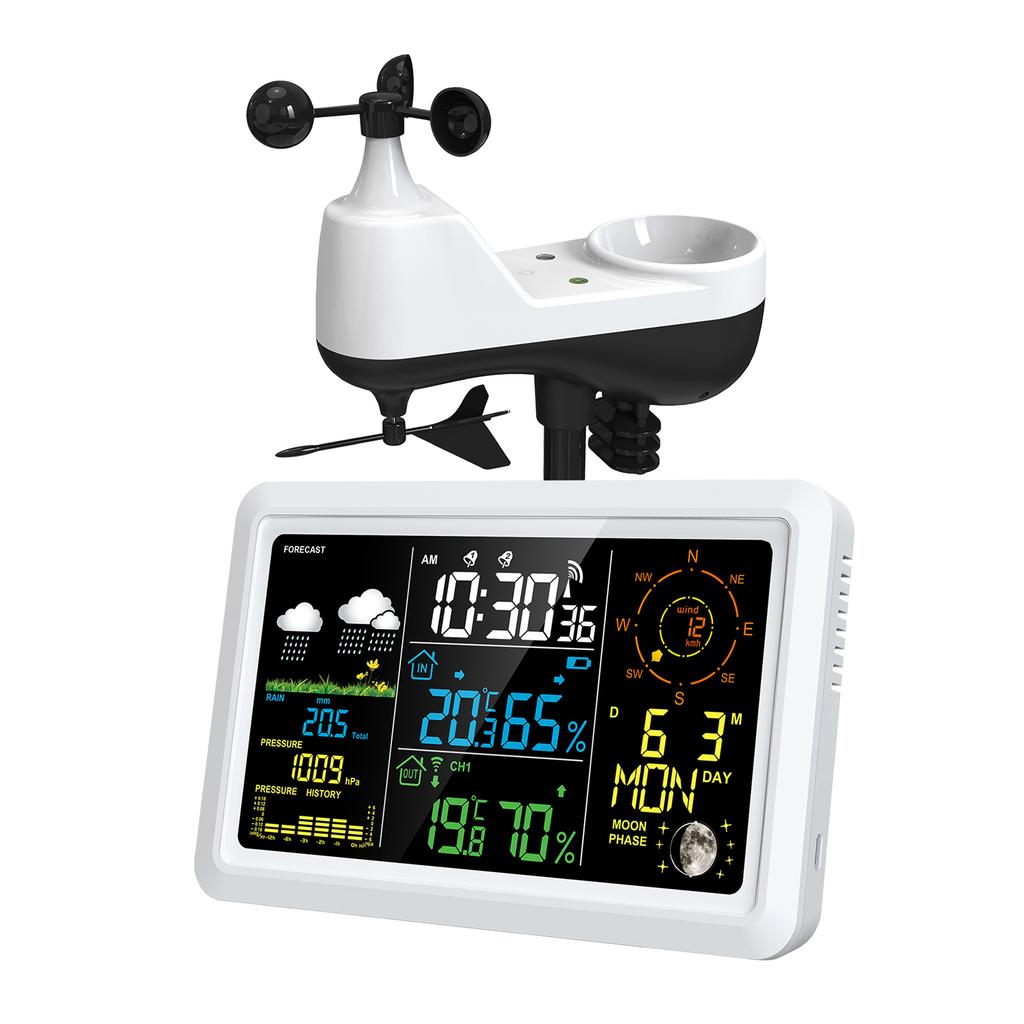 1. Multifunction Weather Station with Color Display: The weather stations color screen displays a wealth of weather information including indoor and outdoor temperature and humidity, weather forecast, calendar, week, moon phase, rainfall, air pressure, wind speed, wind direction, etc., and you can rely on its accuracy to make appropriate plans.