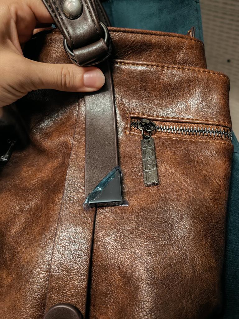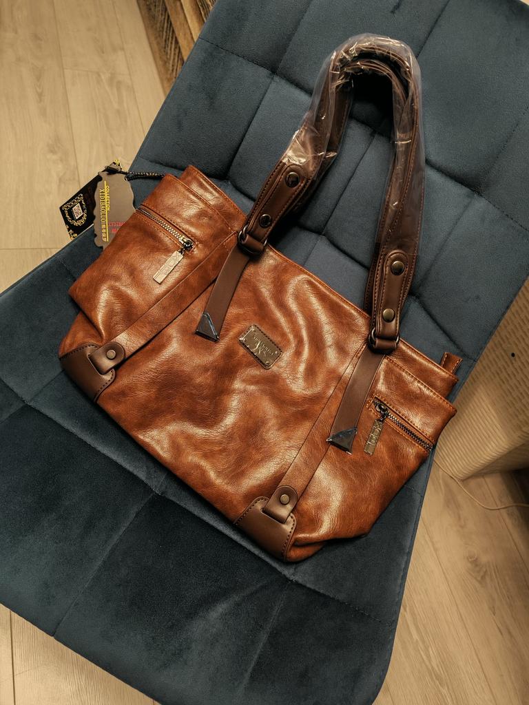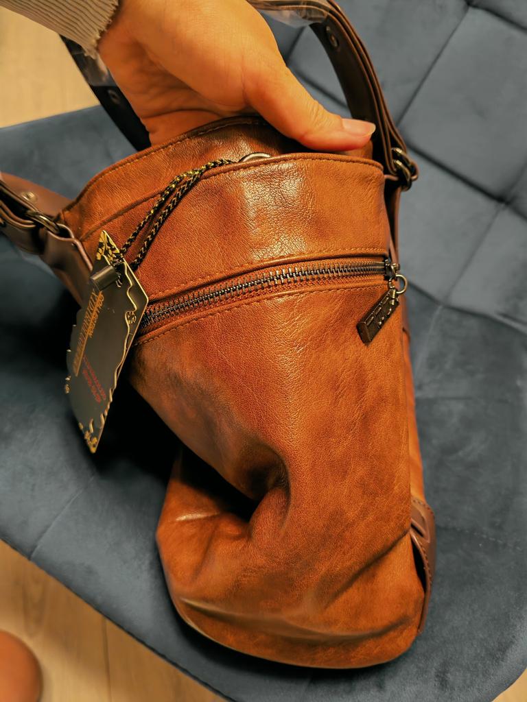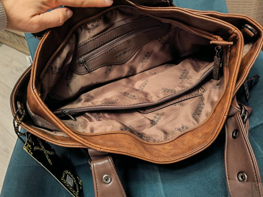 Normal, pretty, large bag. Inside two compartments, separated by a zippered pocket. 4 small pockets: inside, on the back and on the sides.
