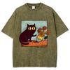 Cartoon Kitten Chrysanthemum Vase Print T-Shirt Round Neck Washed Shoulder Designer 2024 New Trendy Fashion Short Sleeves