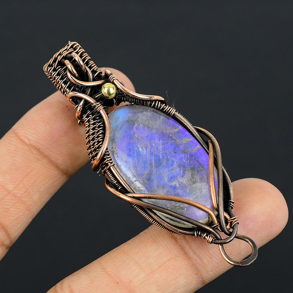 Rainbow Moonstone Handmade Copper Wire Wrap Pendant Jewelry 2.15" L4m25