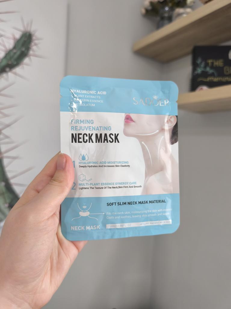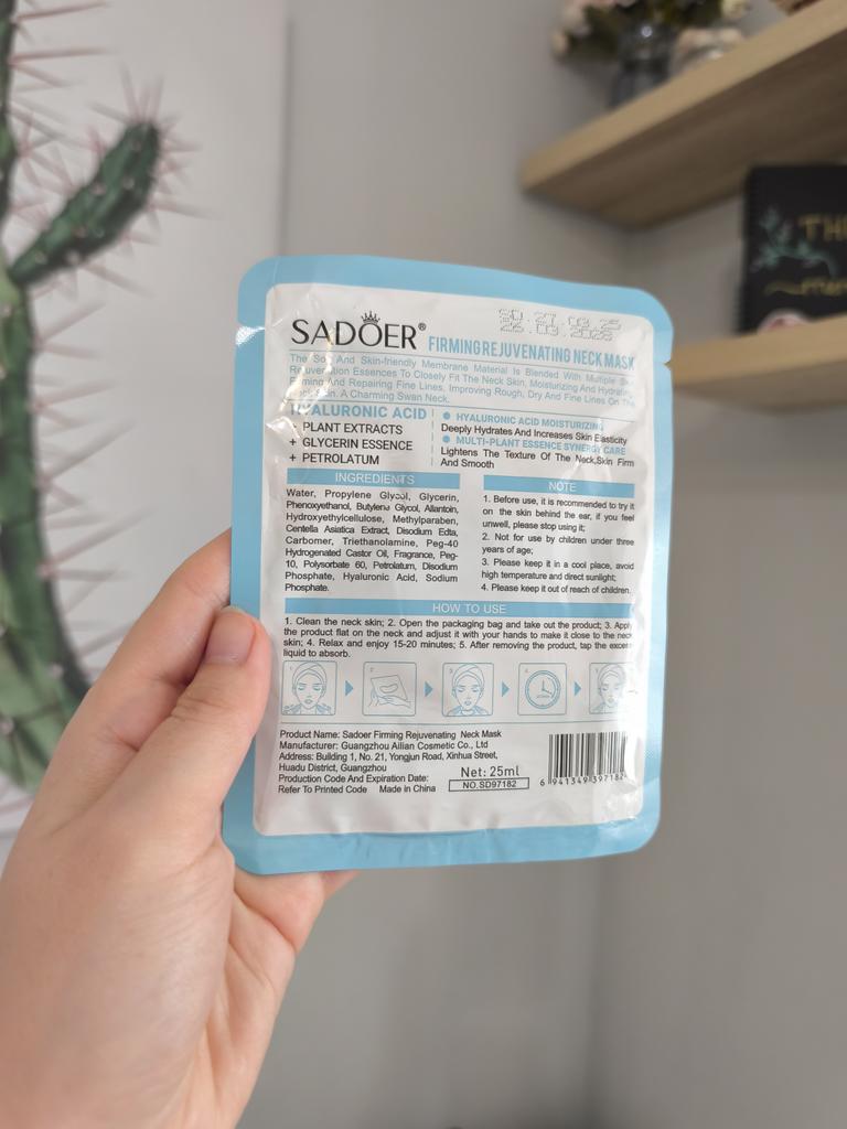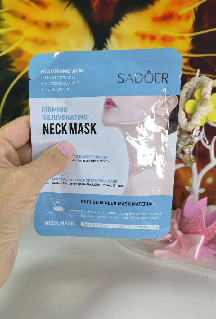 rejuvenating and firming tissue mask for the neck SADOER. Product name: SADOER Firming Rejuvenating Neck Mask. Main Components: Hyaluronic acid, plant extracts, glycerin. Action: Deeply moisturizes, increases skin elasticity, brightens the neck skin tone, makes it firm and smooth. Material features: Soft and thin mask material that adheres well to the skin of the neck, providing a cooling and soothing effect. Definitely recommend.👍