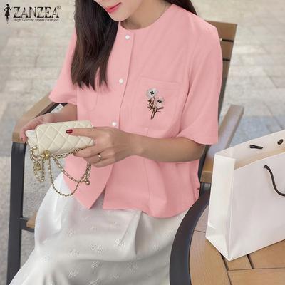 Women Floral Embroidery Casual Round Neck Short Sleeve Blouse