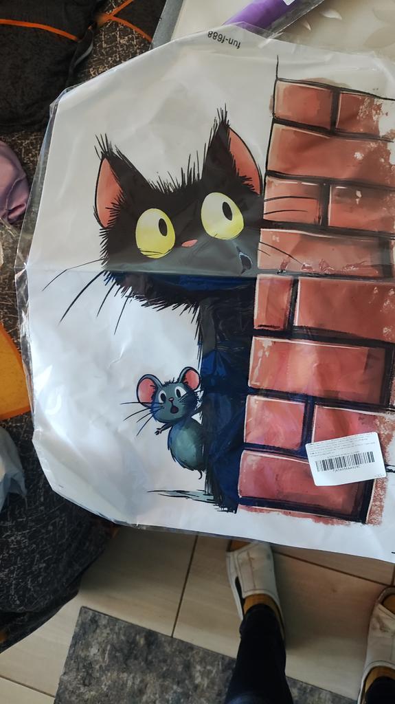Cute kitten with a mouse. Arrived creased, but everything straightened out. I like it very much. Recommend.