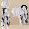Women's Summer Short Sleeve Matching Set Korean Loose Irregular T-shirt Top+Ice Silk Wide Leg Pants Two Piece Suit