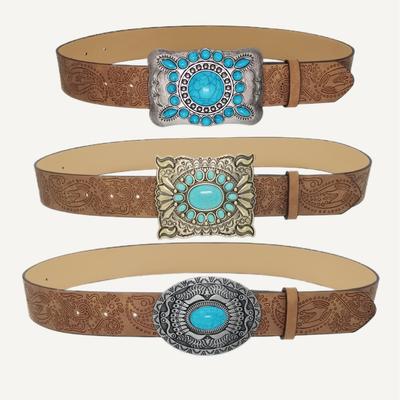Ladies Wear The Classic Western Belt Embossed Pu Leather Bohemian Style Oval Turquoise Buckle Waist Band