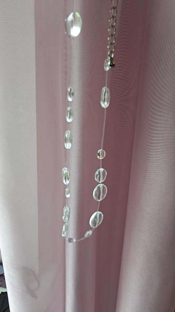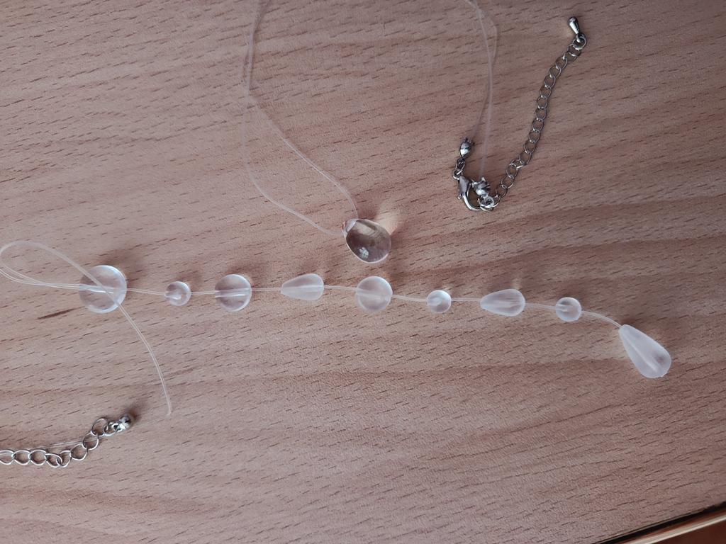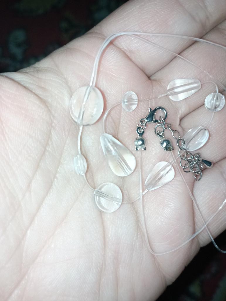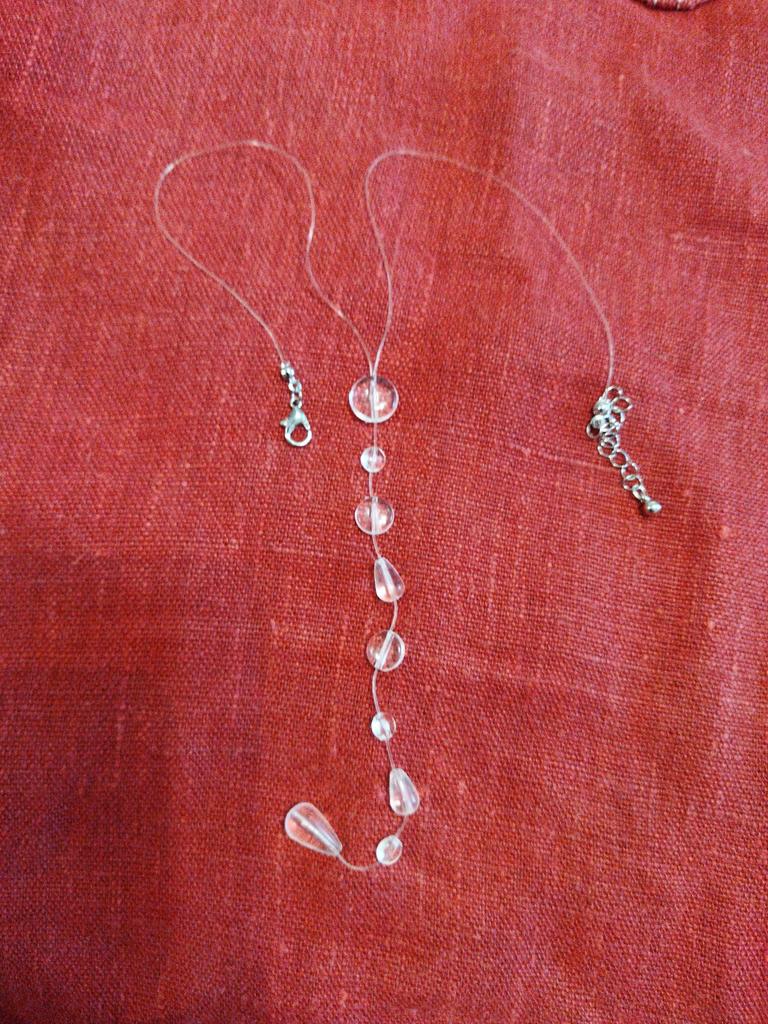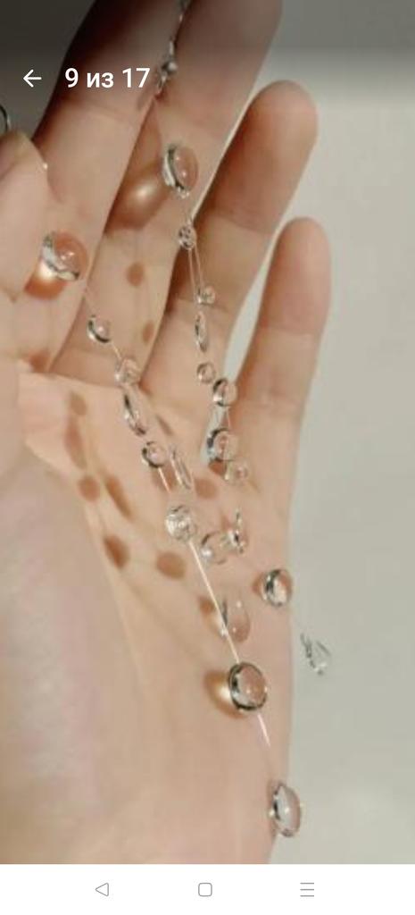 In reality, it's cheap plastic, as similar to drops as bottle glass to emerald. The fishing line on the neck is not visible, but the hole in the bead shines through. It looks very cheap. Not at all like in the picture.