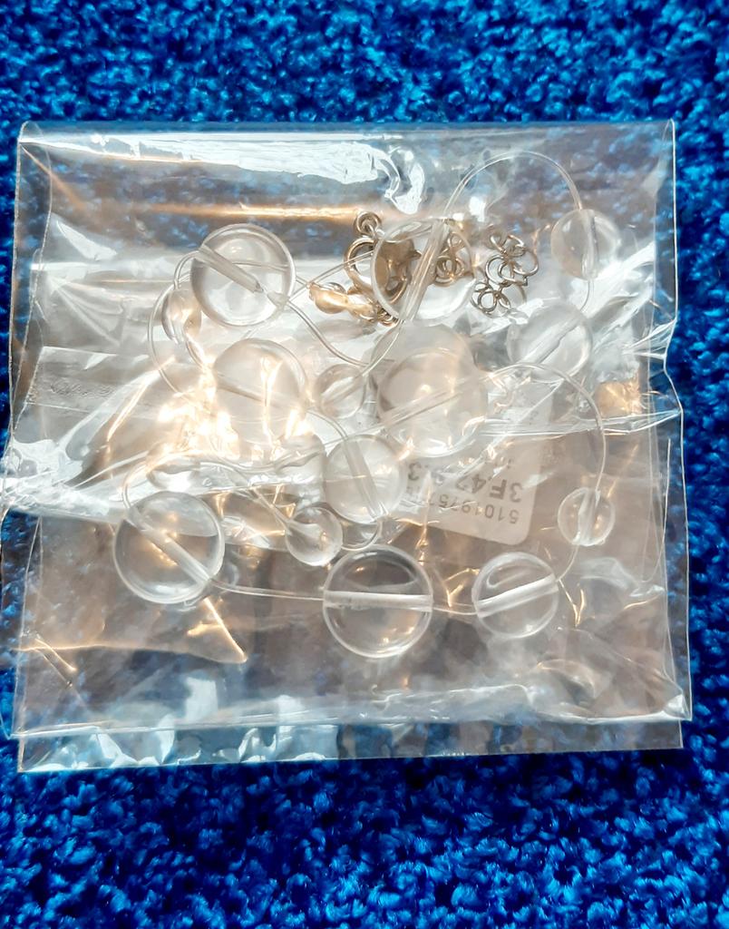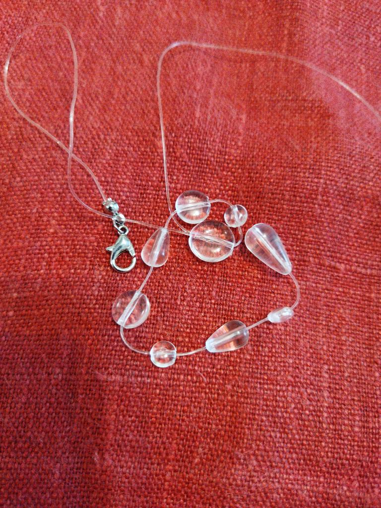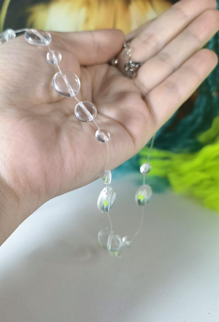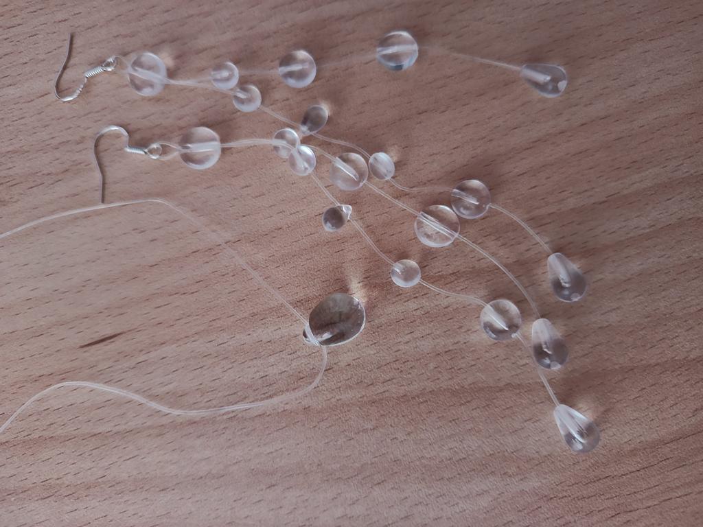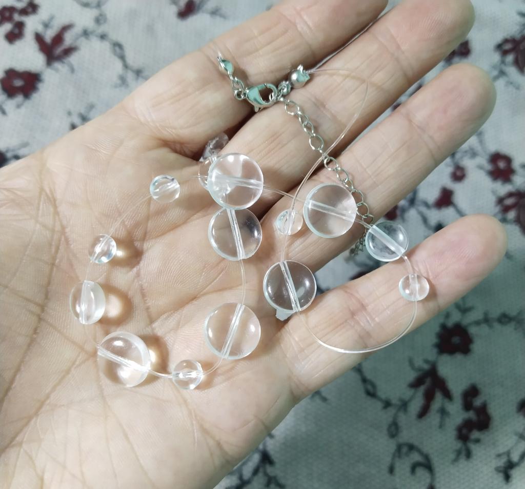 In reality, it's cheap plastic, as similar to drops as bottle glass to emerald. The fishing line on the neck is not visible, but the hole in the bead shines through. It looks very cheap. Not at all like in the picture.