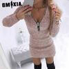 GMXIA S-5XL Autumn Winter Womens Wrap Skirts Zipper Waist Long Sleeve Knitted Dress Hips