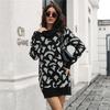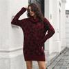 Women Casual Leopard Print Knit Sweater Dress Spring Fall Loose Waist Straight Collar Full Sleeve Above Knee Mini S-L