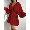 Elegant Fashion Deep V-neck Long Sleeved Women Dress Spring Summer Simple Casual Loose Sexy Solid Color A-line Party Dress Female Office Ladies