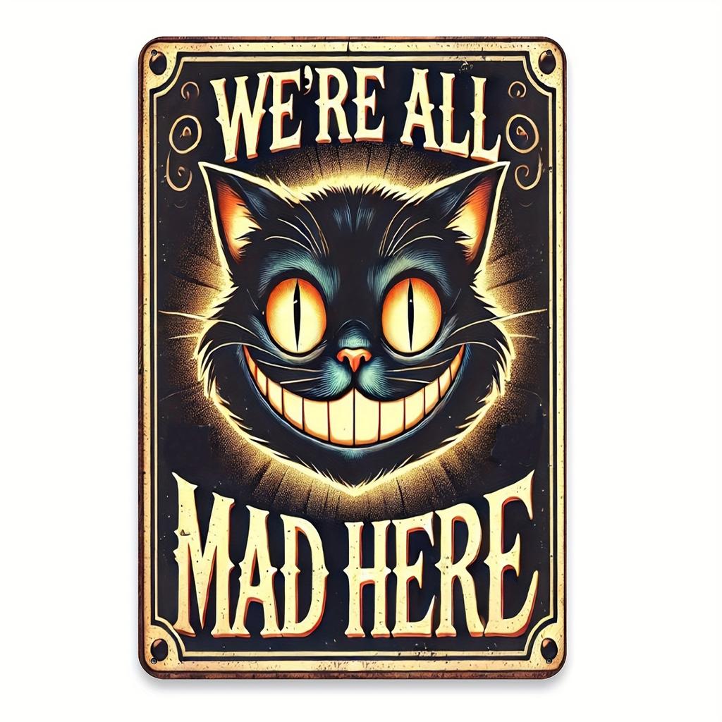 Cat Vintage Metal Tin Sign, "We're All Mad Here" Whimsical Wall Art, Easy To Hang,Unique Gift for Cat Lovers, Room Decor