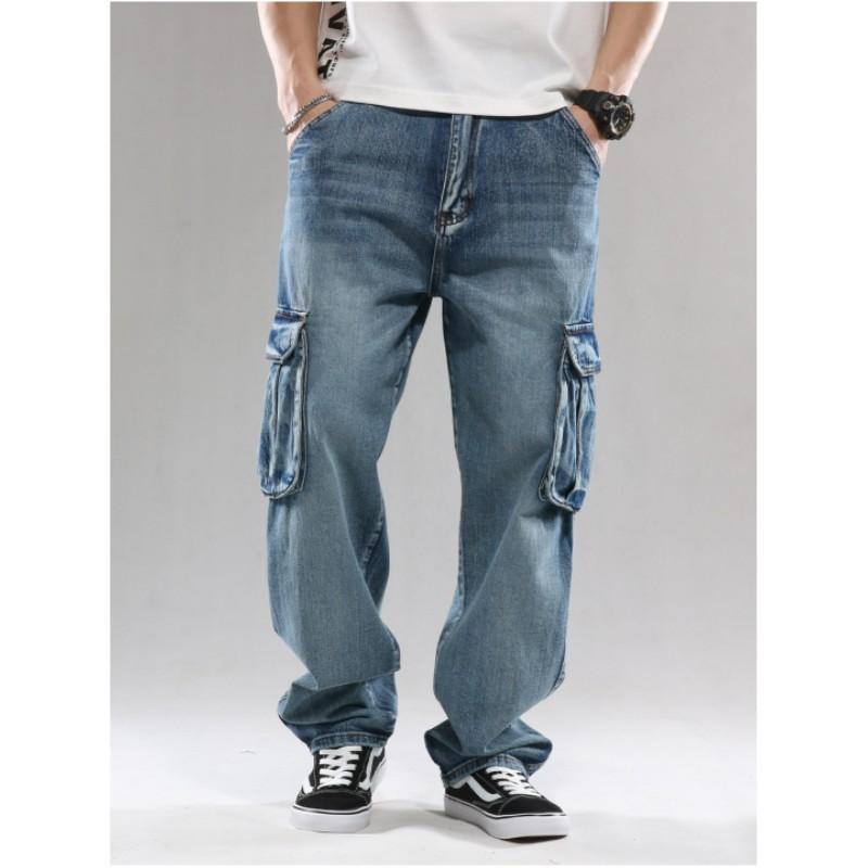 Men's Hip-hop Skateboarding Multi Pocket Workwear Jeans, Oversized Loose Wide Leg Pants