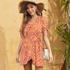 Summer Short-sleeved Floral Skirt V-neck Lace-up Ruffle Edge Holiday Dress