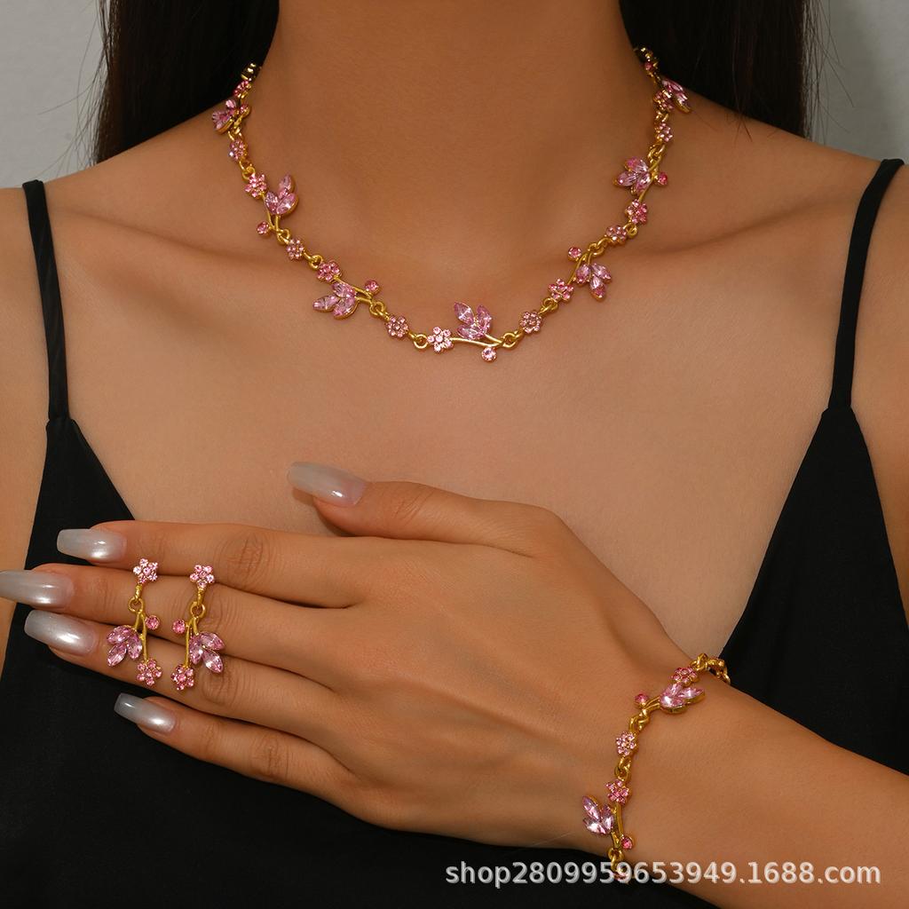 Diamond-encrusted Flower Necklace, Earrings, Bracelet, Women's Niche Design Sense Ins Wind Pink Set.