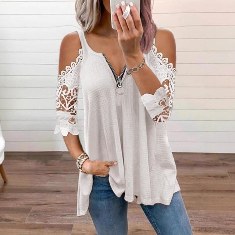Off Shoulder Women Lace Blouse Summer Hollow Out Shirt Half Sleeve Zipper Casual Elegant V Neck Loose T Shirt