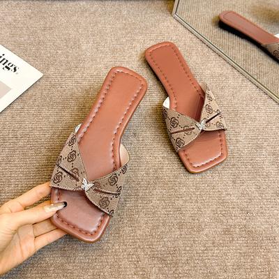 Summer New Simple and Versatile Women's Square Toe Flat Slip-Resistant Beach Slide Monogram Slippers