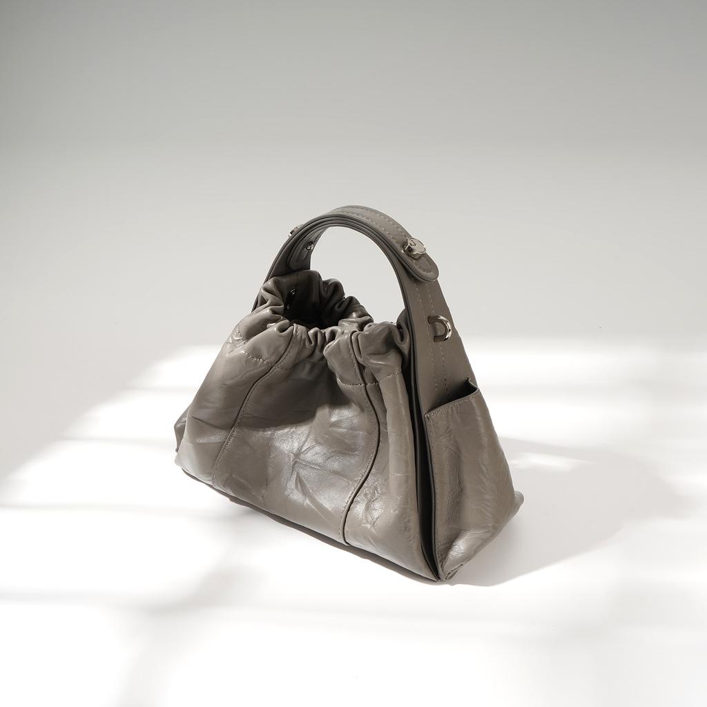 This bag has a stylish, ruched - design dumpling silhouette crafted from top - layer cowhide leather. It features a textured, wrinkled surface, a drawstring - like closure, and dual carrying options (handle and adjustable shoulder strap), creating a fashionable and cute look.