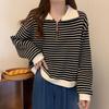 Plus Size Women's American Stripe Polo Collar Sweatshirt - Autumn/Winter Loose Fit Half Zip Long Sleeve Top.