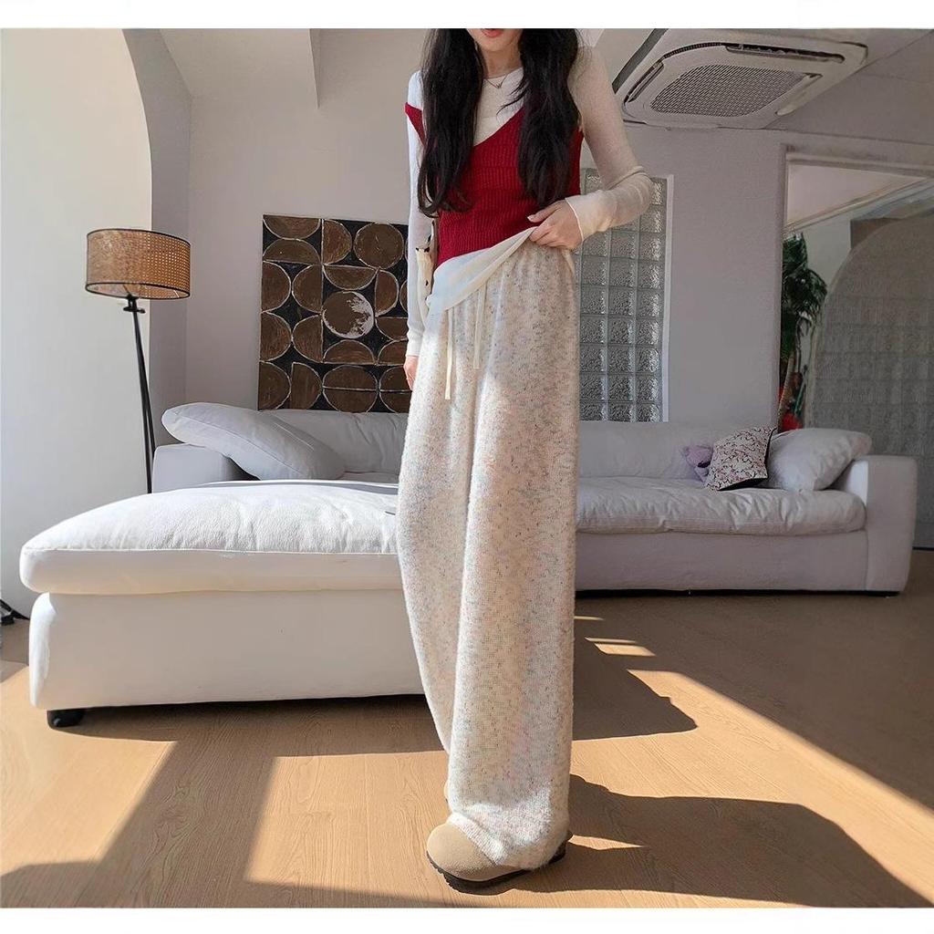 Experience comfort and style with these high-waisted loose knit wide-leg pants, designed for the autumn and winter seasons. Perfect for pear-shaped figures, these trousers offer a casual and sportive look with their floor-length design. Crafted from a unique material blend, they provide a warm and cozy feel while ensuring a trendy fit. Ideal for both relaxed outings and laid-back athletic wear, these pants effortlessly combine fashion with functionality.