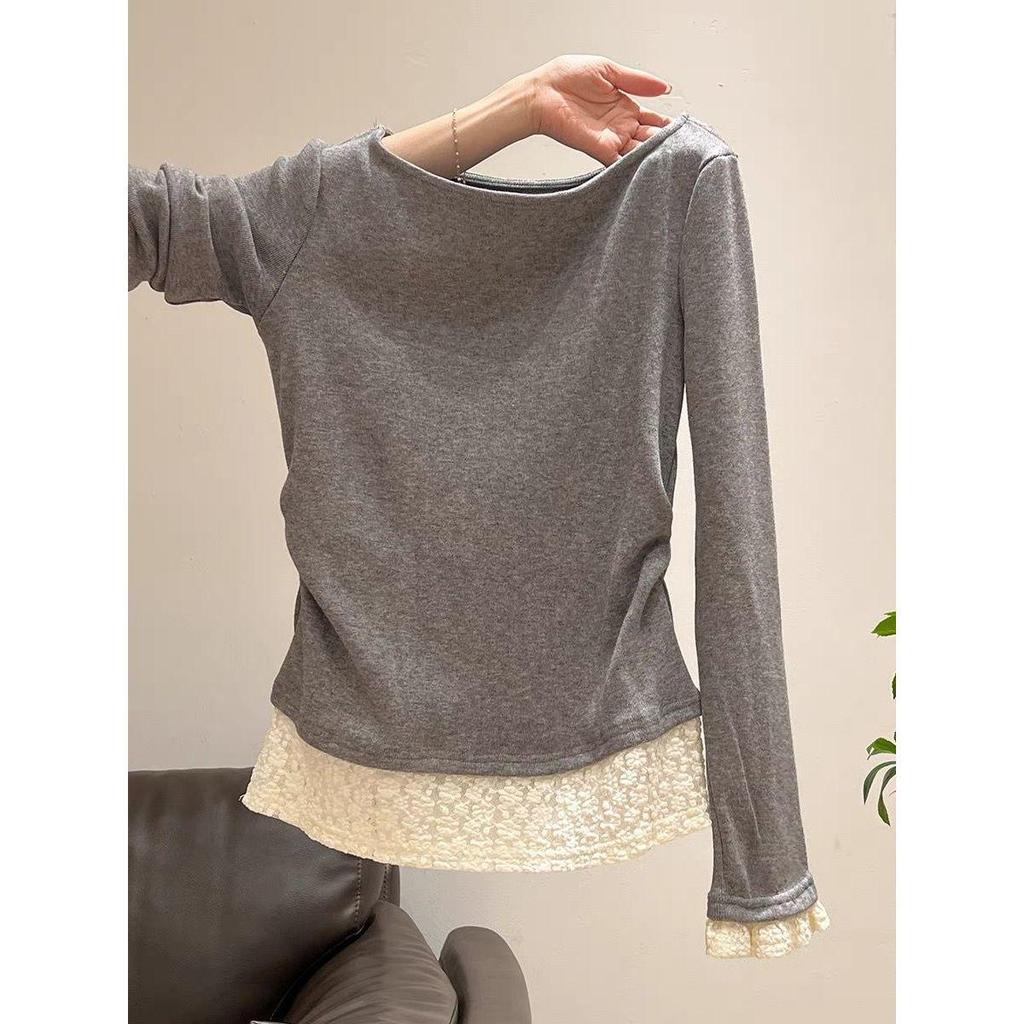 Women's Ruched One-Shoulder Long-Sleeve Top with Lace Hem, Perfect for Early Spring