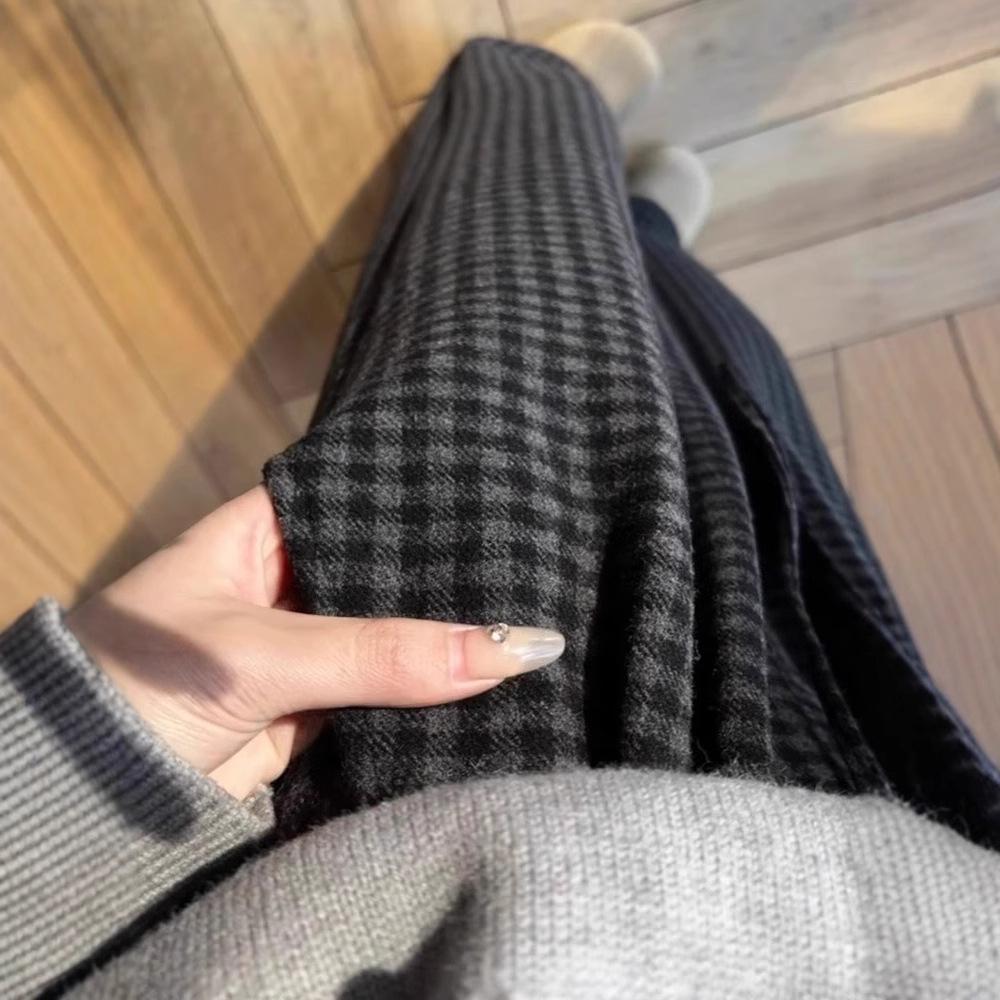 These high-waisted, wide-leg plaid wool pants offer a stylish retro vibe perfect for autumn and winter seasons. Designed in a petite fit, they provide both comfort and flair with a touch of modern sportive style. Crafted from a blend that includes spandex, they ensure ease of movement while maintaining a chic silhouette. The timeless black and gray color scheme makes them a versatile addition to any wardrobe, easily paired with various tops and accessories for both casual and dressy occasions.