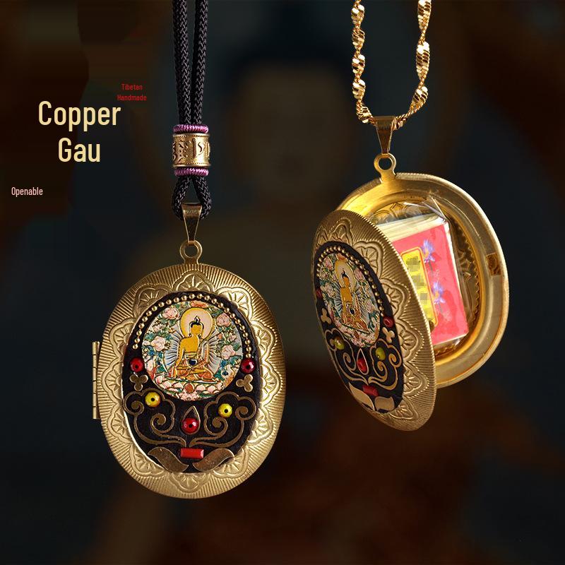Vairochana Yellow Tibetan Amulet: Brass Box Pendant Necklace with Jambhala & Avalokiteshvara Hollow Design