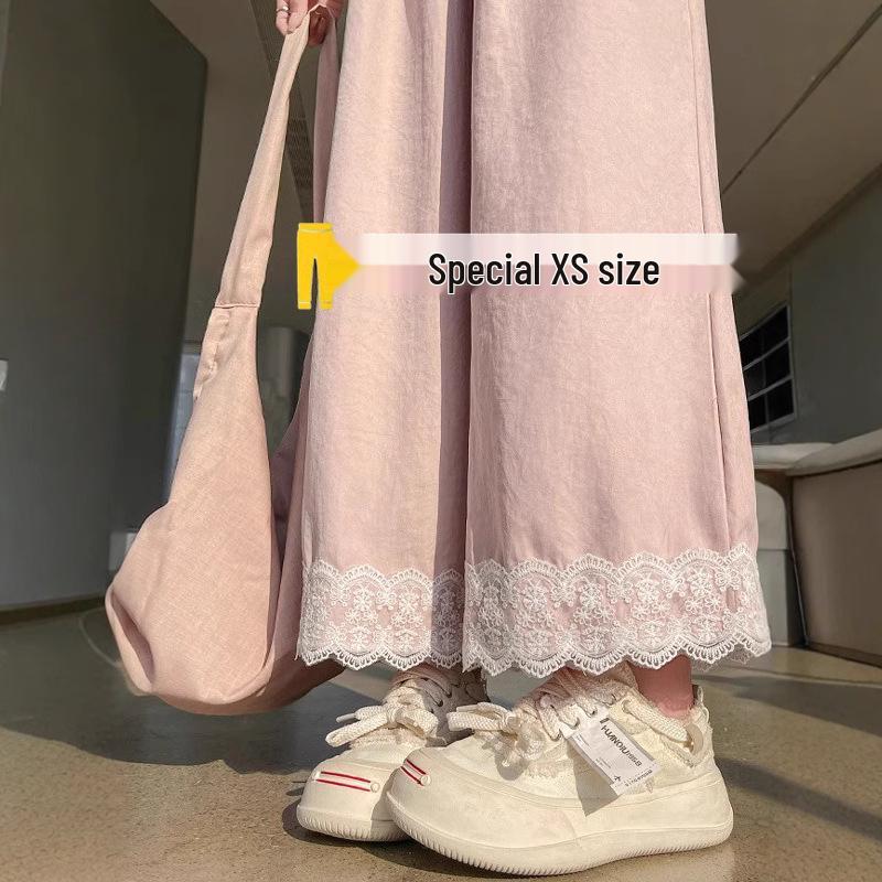 Embrace a sporty yet chic look with these wide-leg pants designed for the spring and summer seasons. Crafted from comfortable spandex, these pants ensure a flexible fit that moves with you. The distinctive pink hue is enhanced by a delicate lace trim, adding a touch of femininity to the sportive style. Perfect for casual outings or relaxed weekends, these pants offer a unique blend of style and comfort.