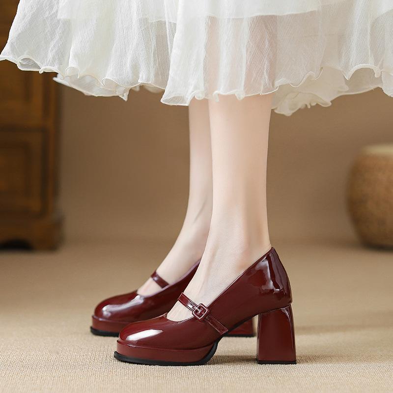 Spring New Versatile Small Leather Shoes Red Wedding Thick Heel Heightening Waterproof Table Mary Jane Shoes Women's Single Shoes