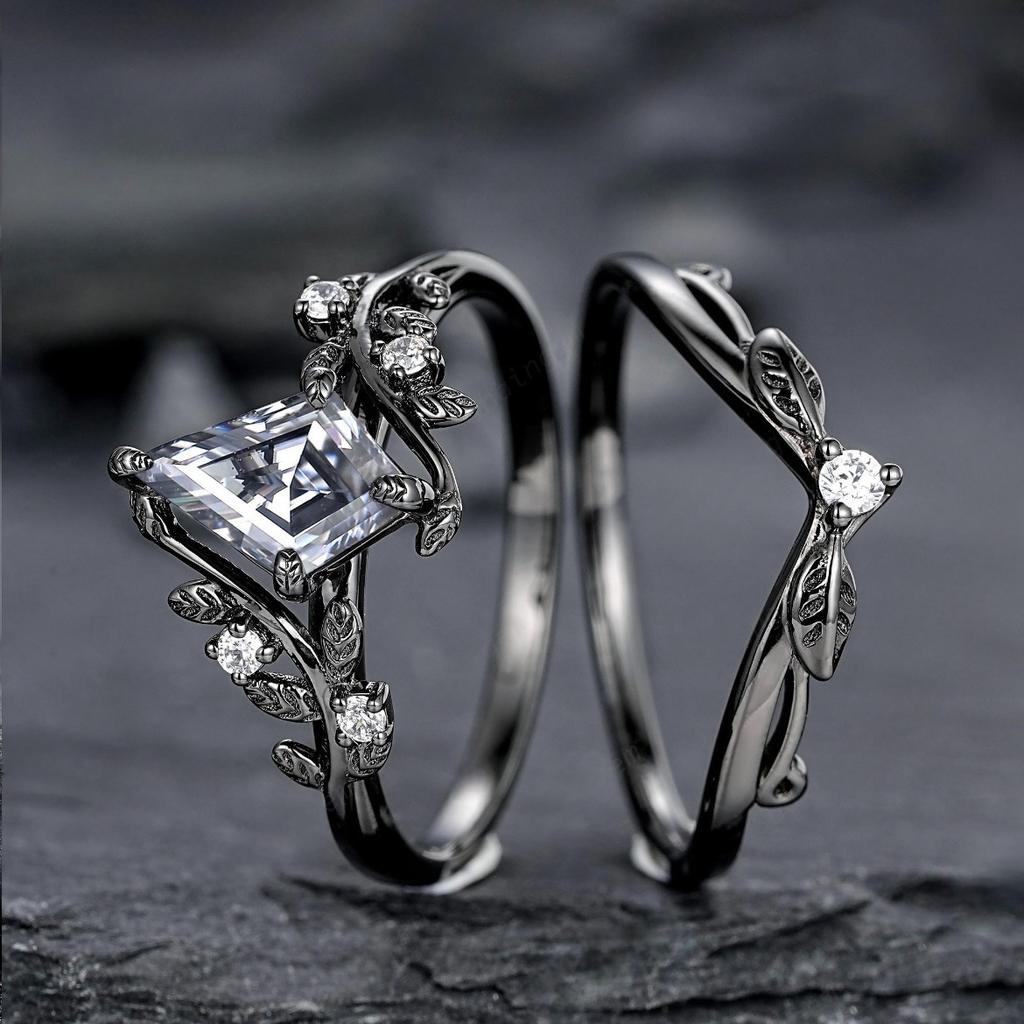 Charm Black Color Round White Stone Leaf Rings Set Fashion Party Jewelry Rings for Women