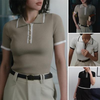 Knitted Pullover Short-sleeved Patchwork Top Elegant Slim-fit Contrast Color Lapel Pullover Top