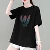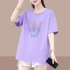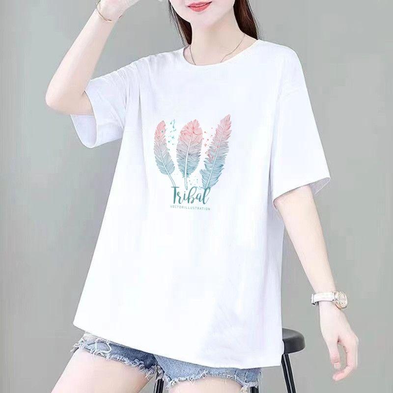 Cotton Casual Feather Pattern T-shirt Women Summer New O-collar Short Sleeve Slim Mid Length Version Loose Lady All-match Top