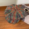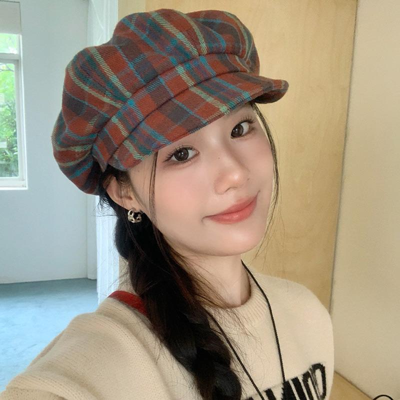 Red Plaid Painter Hat Female Fashionable Beret Showing Face Small Peaked Hat Big Head Circumference Cloud Hat Versatile Octagonal Hat
