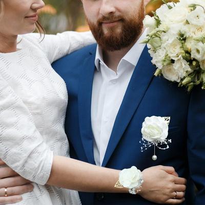 1Pc Simulation Bridesmaids and Groomsmen Wedding White Rose Green Plant Corsage Wrist Flower