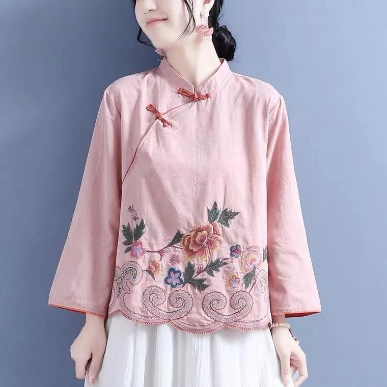 Spring Retro Chinese Style Embroidered Cotton and Linen Shirts Buttoned Long-sleeved Stand-up Collar Clothes Loose Tops