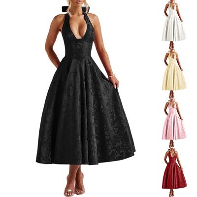 Ladies' V-neck Hanging Neck Solid Color High-end Evening Dress Summer Temperament Sleeveless Backless Waist Cinched Dress