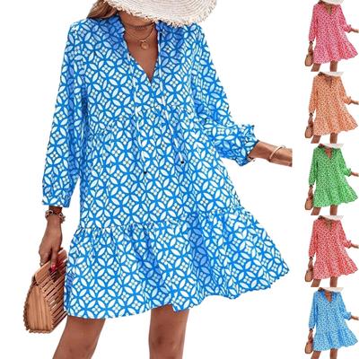 2023 V-neck Print A-line Women Dress Vintage Long Sleeve Ruffled Summer Short Dresses Lace-up Lady Casual Beach Boho Dress 28719