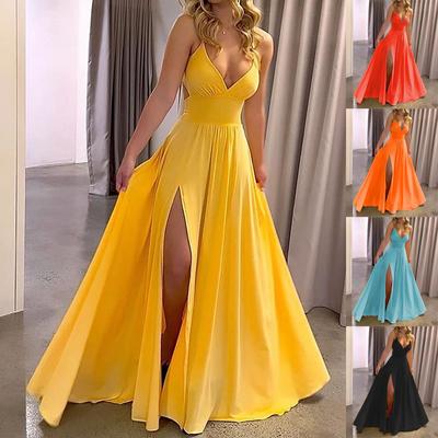 Women Ball Gown Off Shoulder Low-cut V Neck Backless Sleeveless Solid Color Split