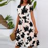 Women's Casual Fashion Round Neck Pleated Short Sleeve Floral Print A-Line Midi Dress